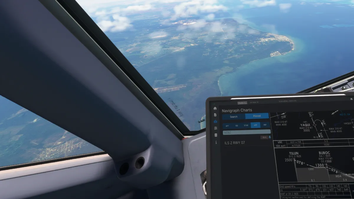 Se realizó la aproximación MUSIV1A, aproximación ILS-Z transición YAQUI, para aterrizar en la pista 07 del aeropuerto MZBZ Belize City Philip S. W. Golds (Belize)