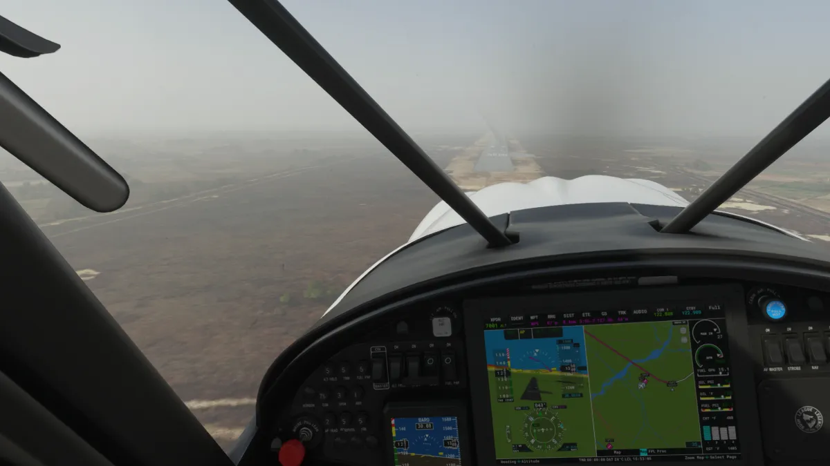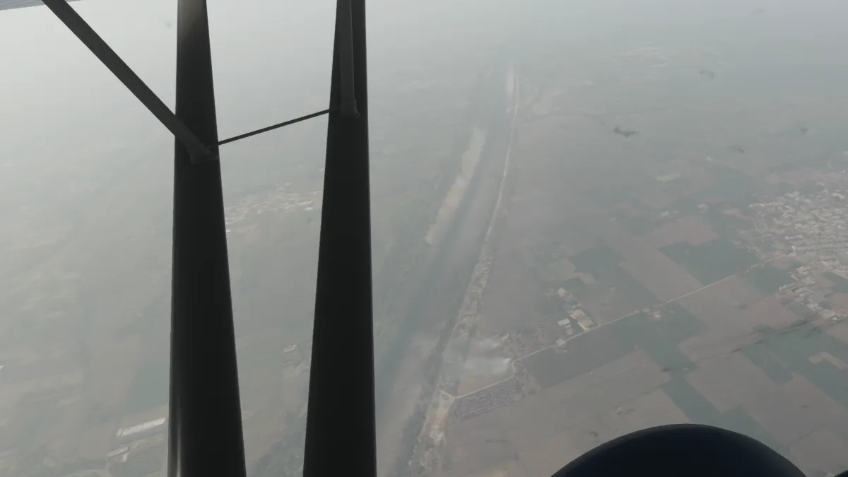 Ya aproximándonos al tramo final, la cuarta toma y despegue fue en Mangla (OPMA) donde ingresamos a viento en cola del circuito a derecha para la pista 14. En el siguiente aeropuerto, Sialkot Intl (OPST) realizamos una pasada baja por la pista 04, ya que la visibilidad se encontraba reducida por humo.