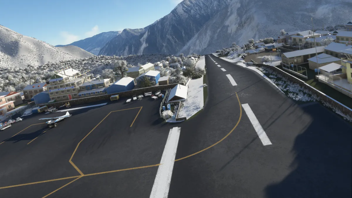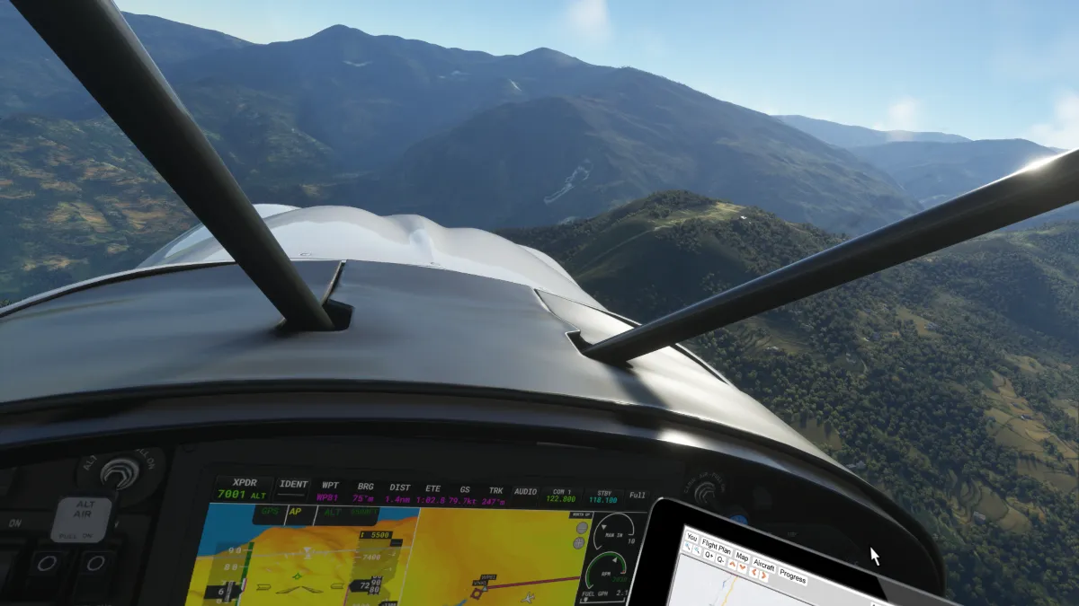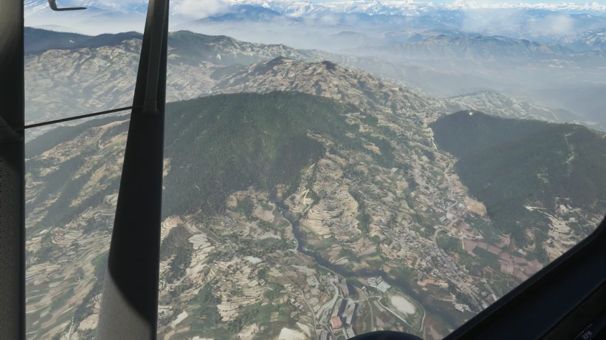 Comenzamos la etapa hacia el Himalaya y el monte Everest, volando al norte y comenzando a ascender, realizando una segunda toma y despegue en la llanura elevada de 6800 pies del aeródromo Kangel Danda Airport (VNKL) ingresando por base y final de la pista 29.
