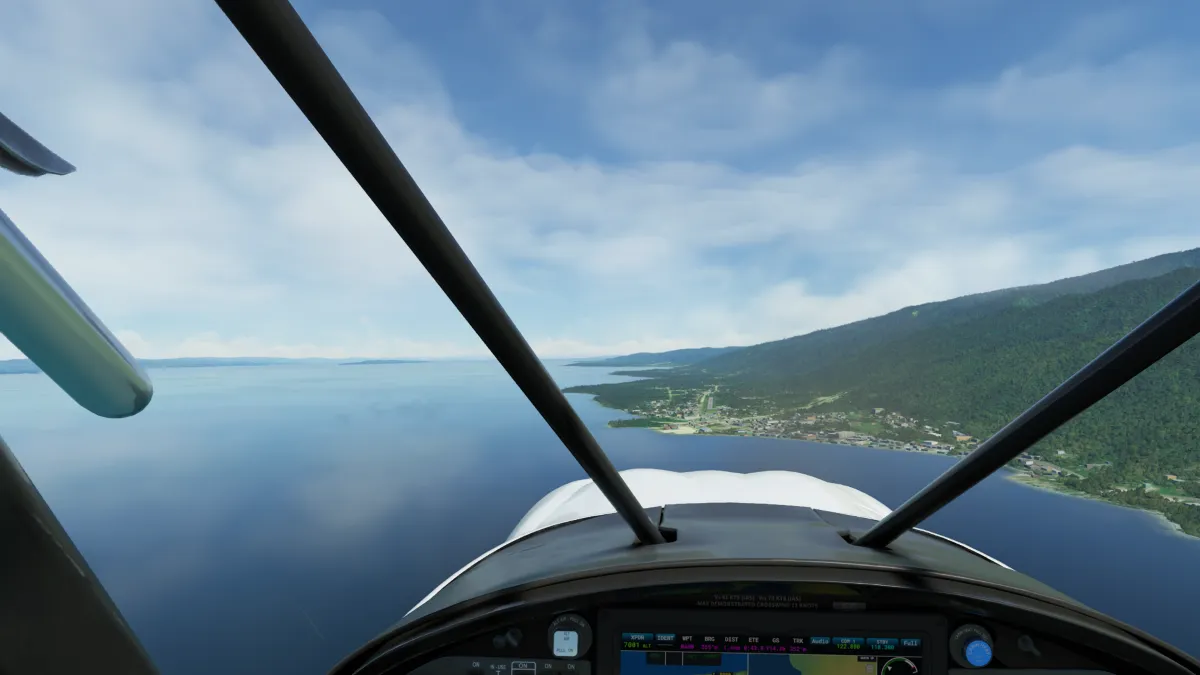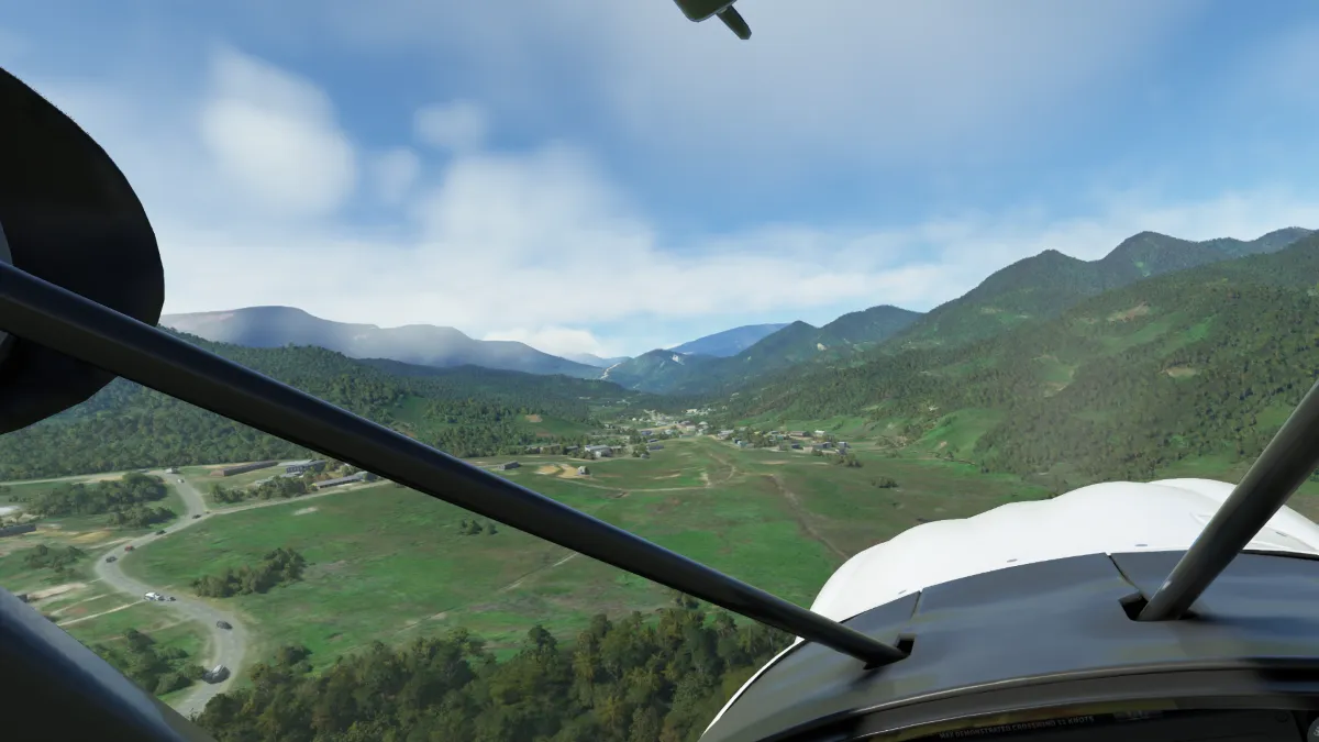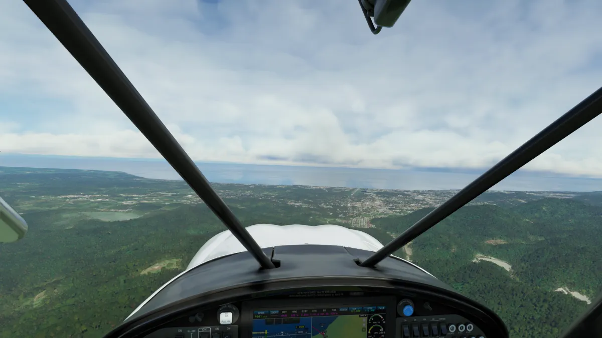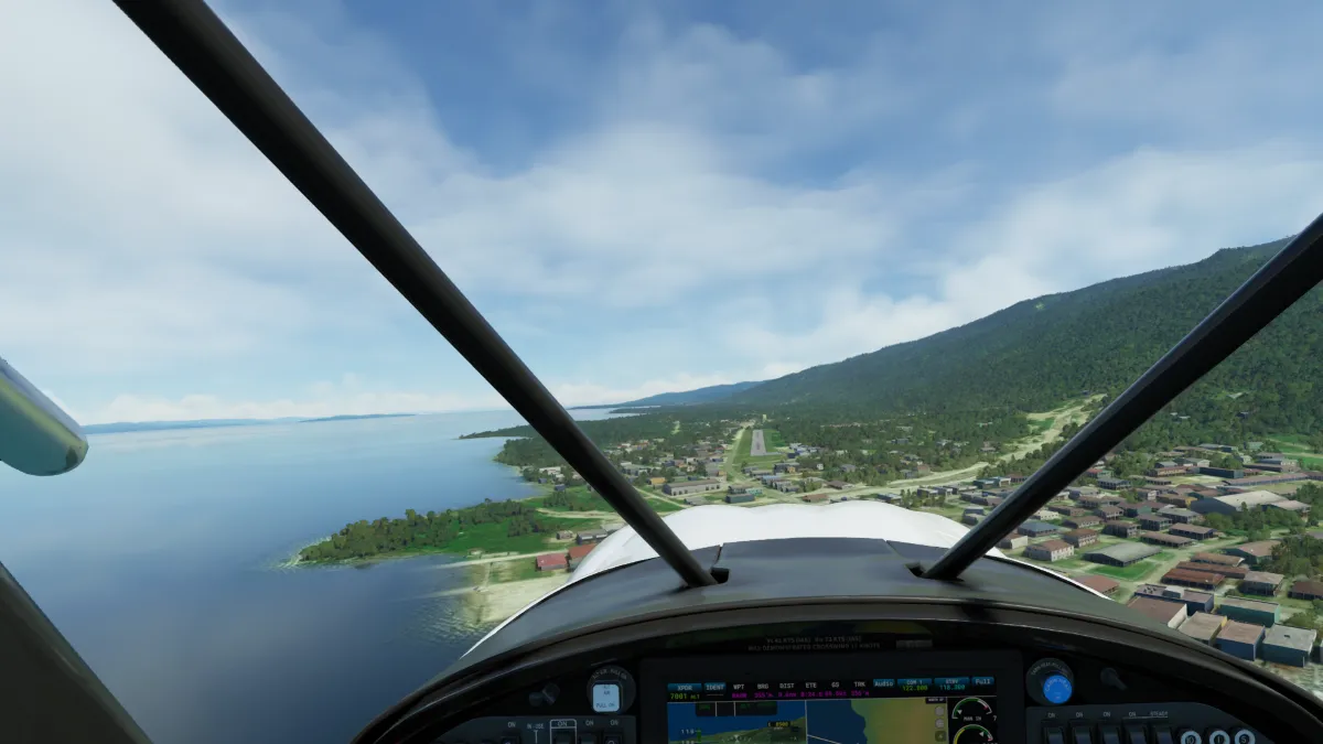 Tras atravesar las montañas en cercanías del pico Pegunungan Weyland, comenzamos el descenso hacia la costa norte y la ciudad de Nabire, donde realizamos otra toma y despegue en el aeropuerto Nabire (WABI) ingresando a final de la pista 34.
