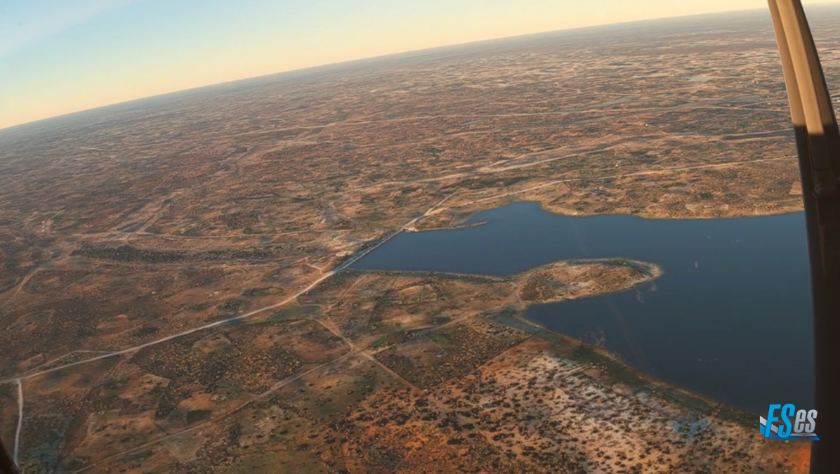 Sobre el lago formado por la presa Olushdanja tomamos rumbo sur, sureste realizando una toma y despegue en el aeropuerto Okahao (FYOH) por pista 09 desde donde procedimos al lago Oponono.