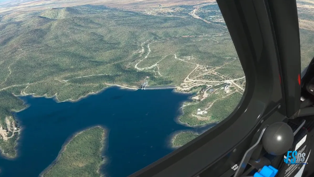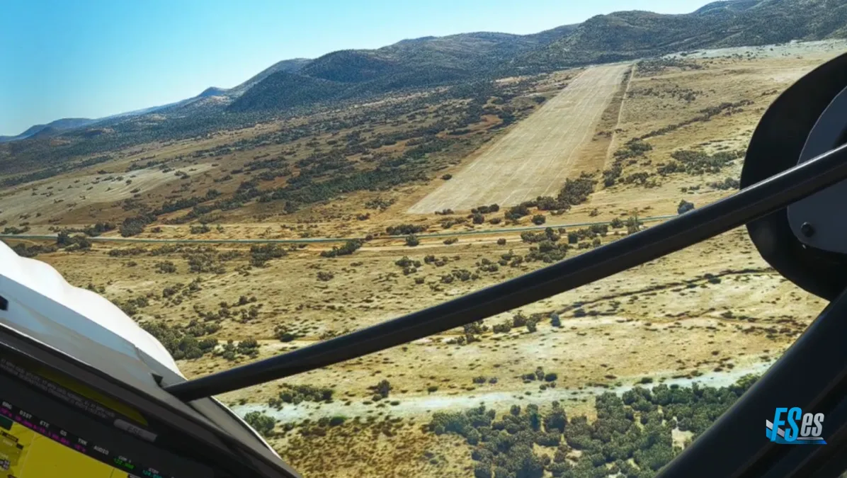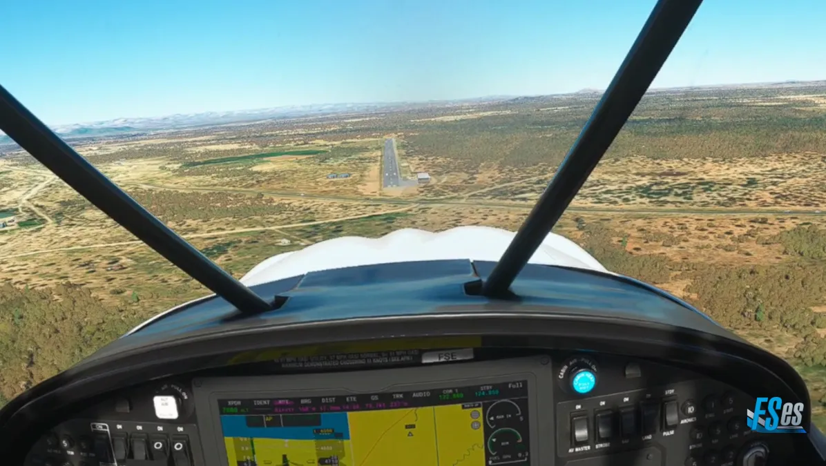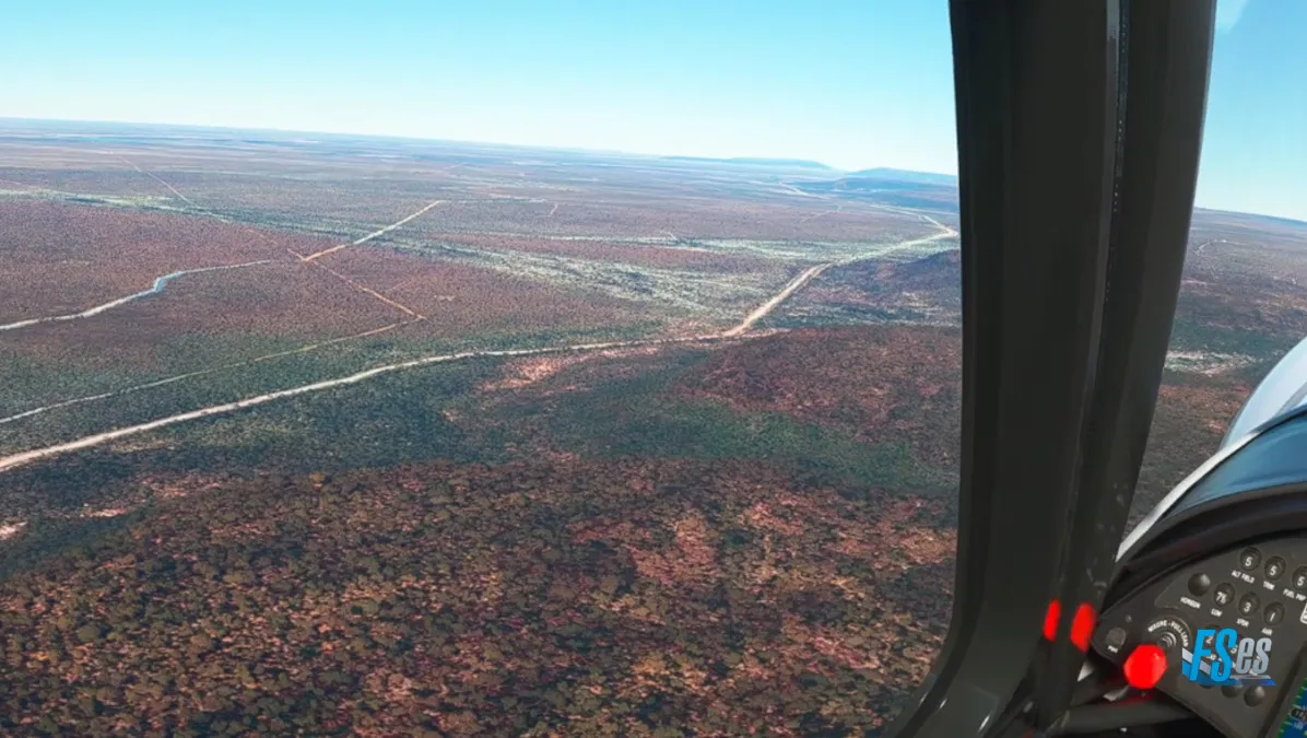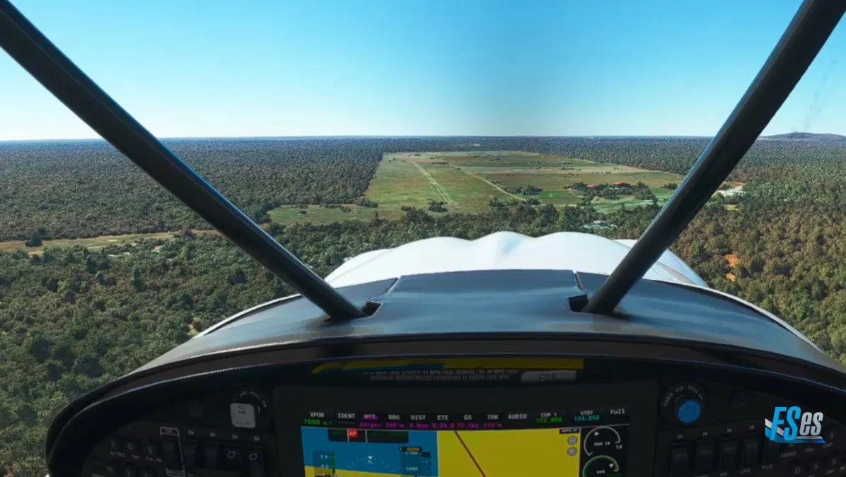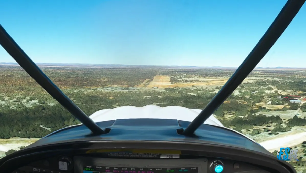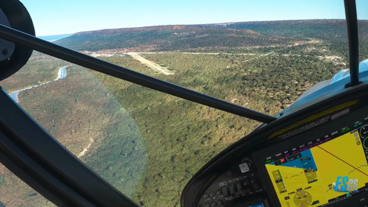Por último y ya cerca de nuestro destino realizamos la ultima toma y despegue en el campo Osona Airstrip (FYSN), el mismo cuenta con 2 pistas cruzadas, ambas de césped/tierra, nosotros cruzamos el aeródromo sobrevolando la pista 15/33 y realizamos circuito a derecha para tomar por pista 06, y en la salida teniendo que ascender y girar inmediatamente a derecha, puesto que por delante existen unas sierras altas.