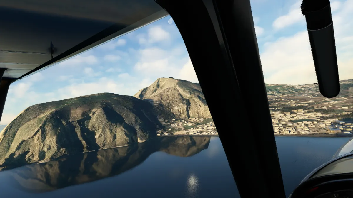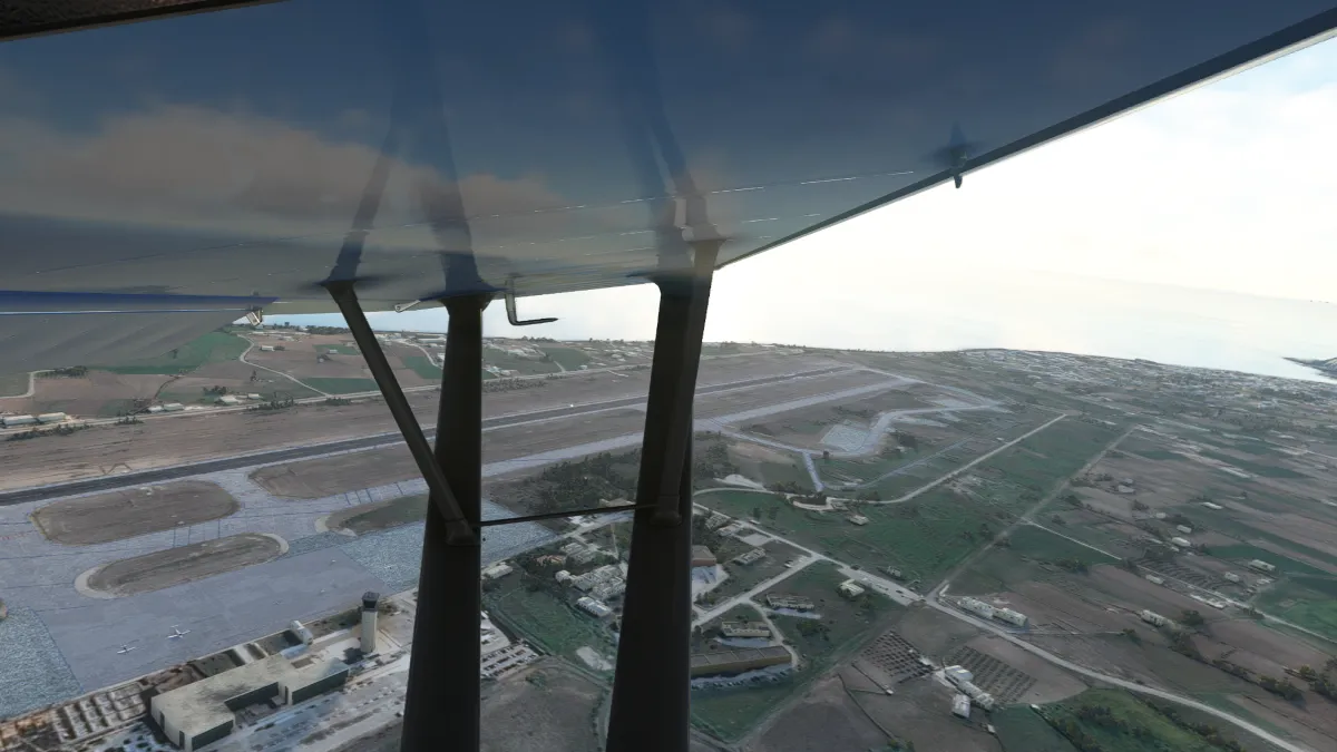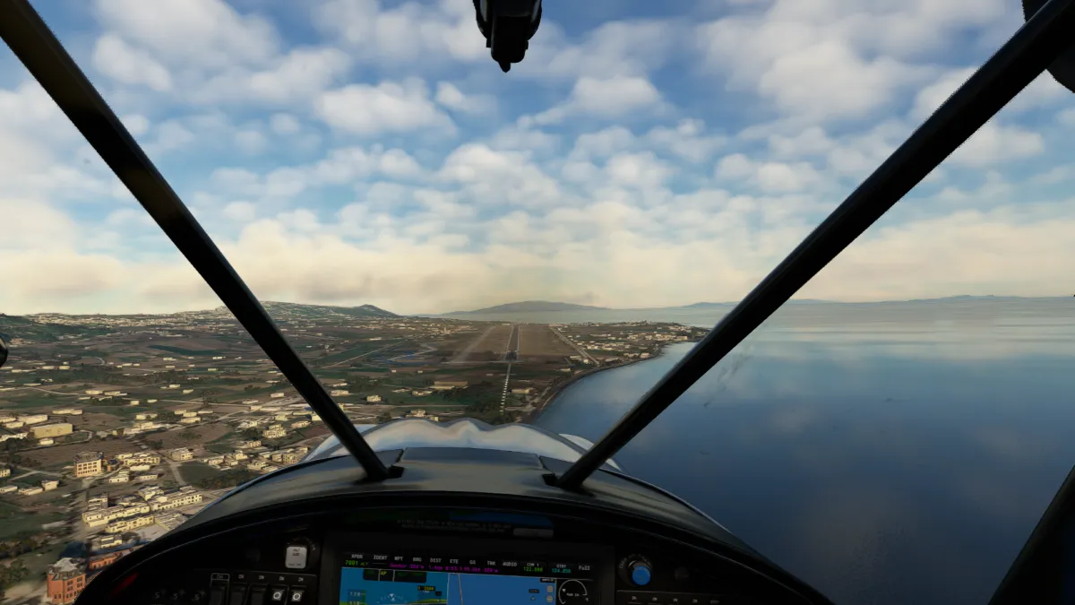 Aproximándonos a Santorini, nos dirigimos a hacia Kamari, para realizar una toma y despegue en el aeropuerto Santorini (LGSR), ingresando a base sobre la playa Kamari y luego a final derecha para la pista 33.