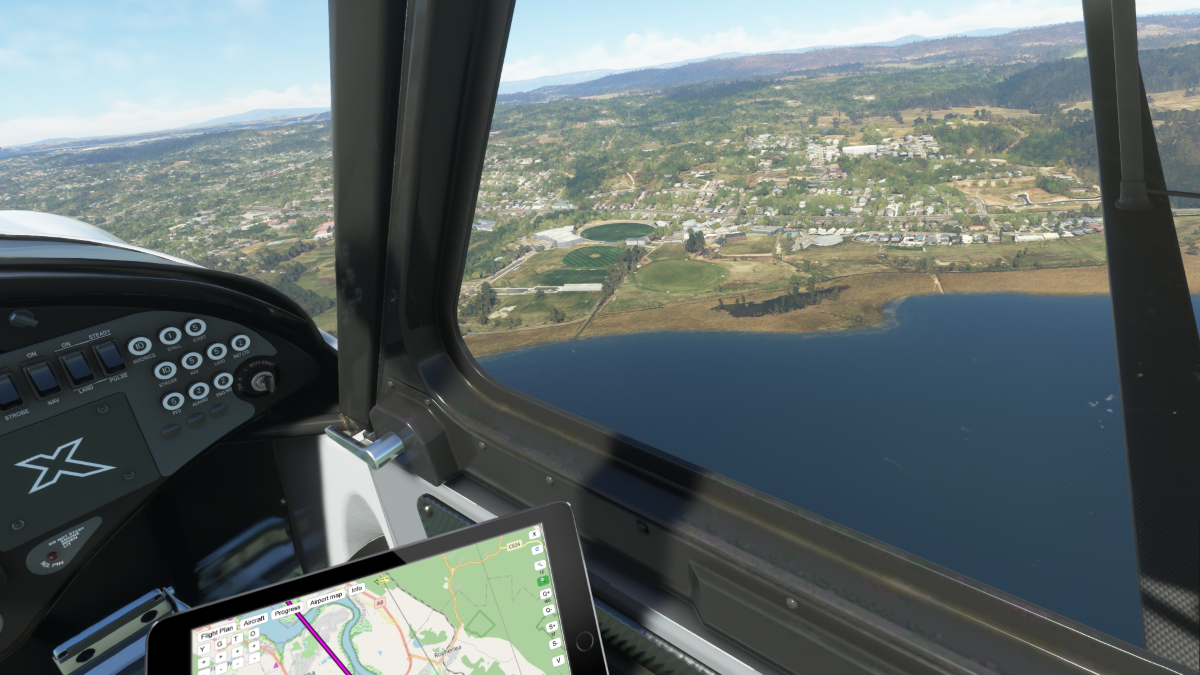 Llegando al lago Jundabyne, realizamos la primera toma y despegue aproximando base y final a izquierda para la pista 30 del aeródromo Jindabyne (YJIN).