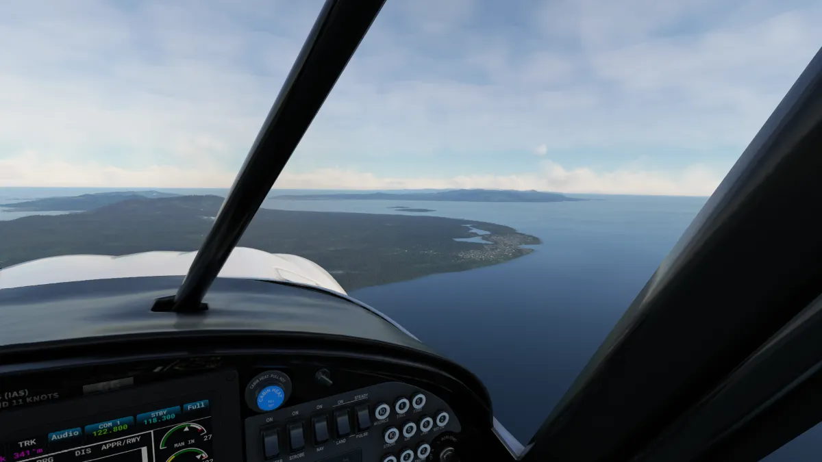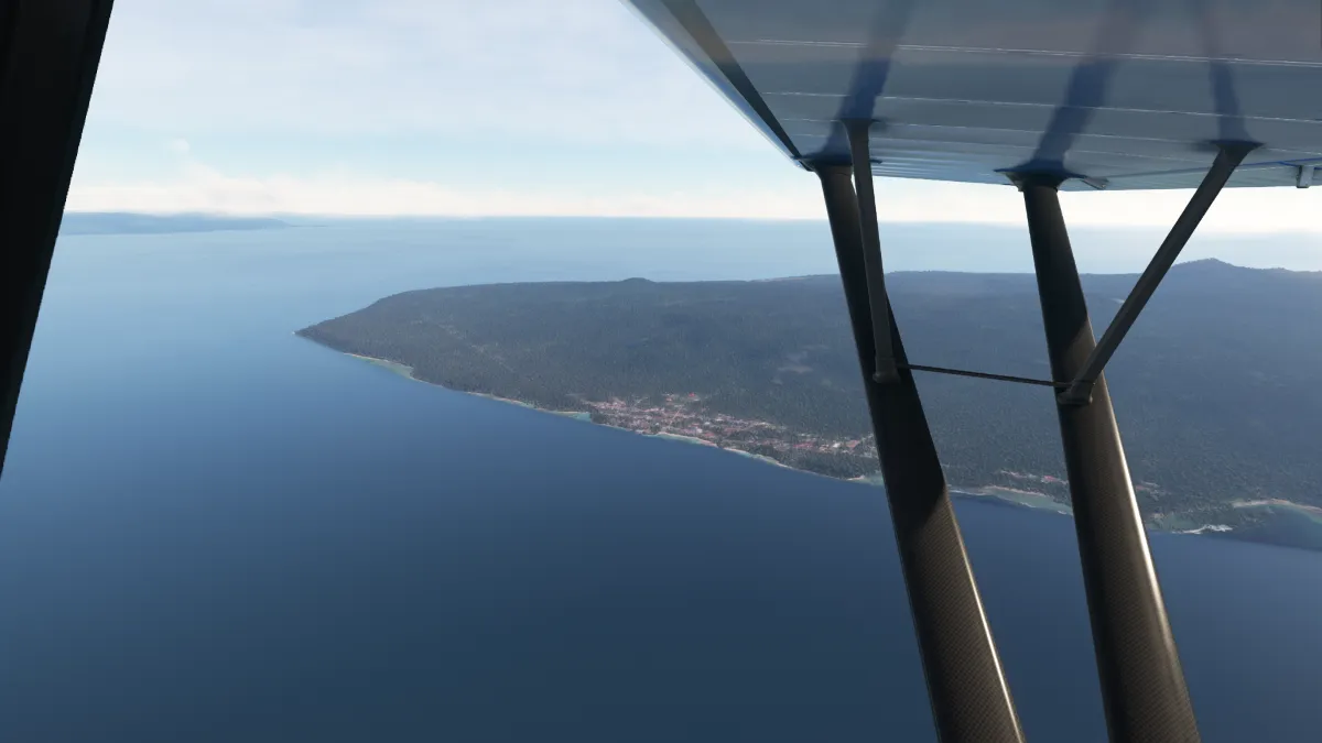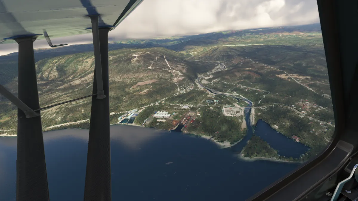 Tras atravesar las montañas en cercanías del pico Pegunungan Weyland, comenzamos el descenso hacia la costa norte y la ciudad de Nabire, donde realizamos otra toma y despegue en el aeropuerto Nabire (WABI) ingresando a final de la pista 34.