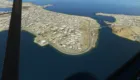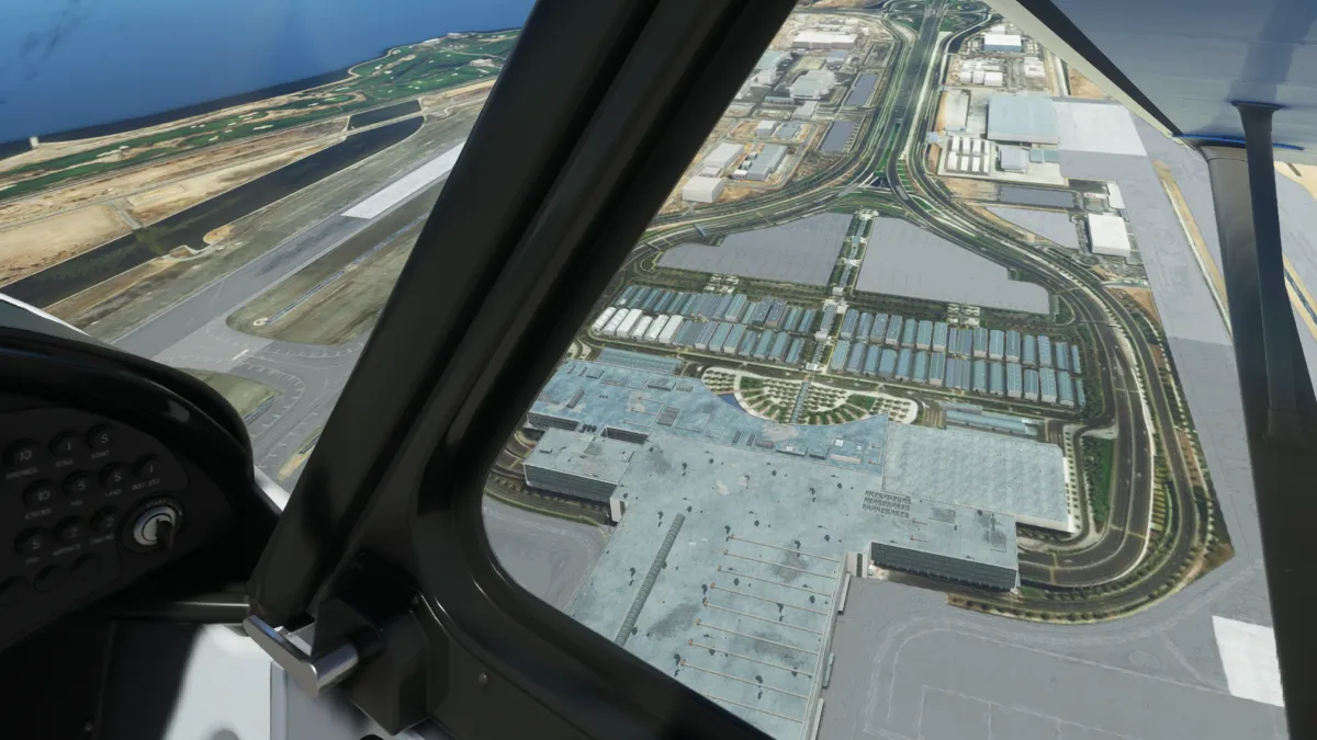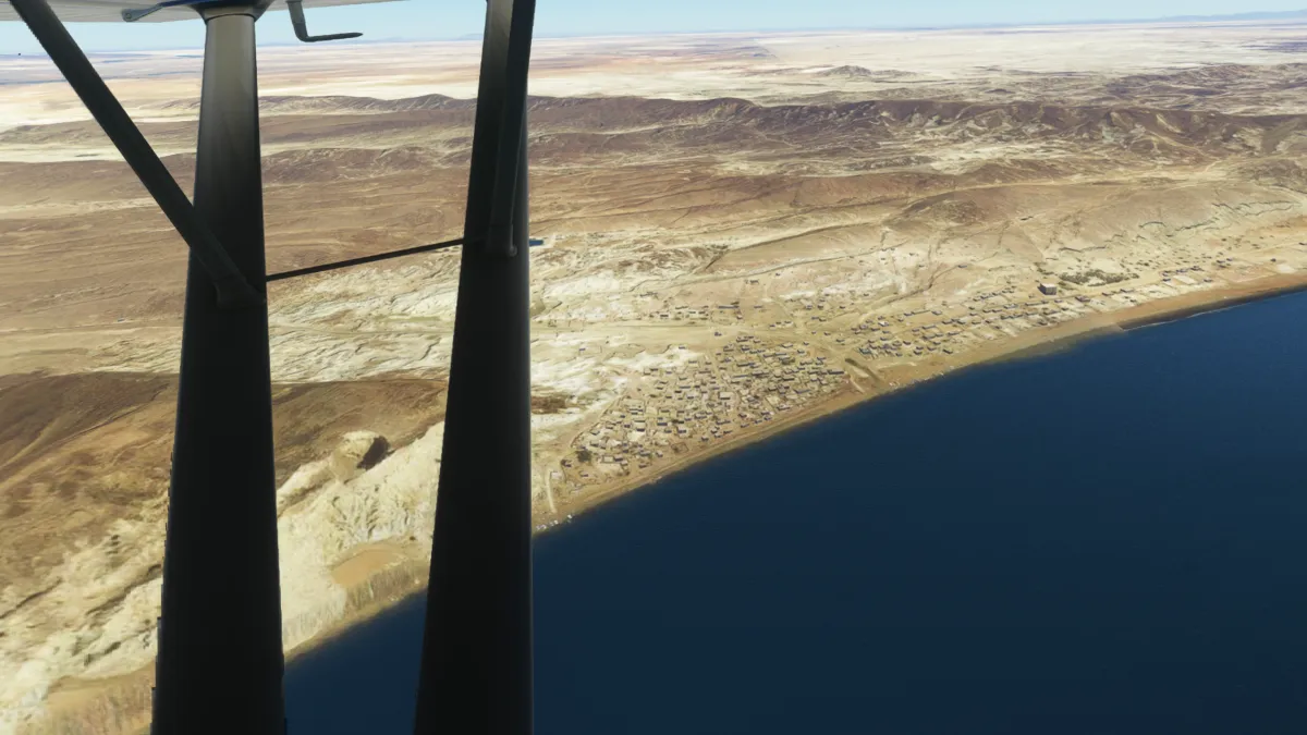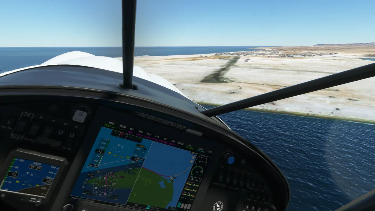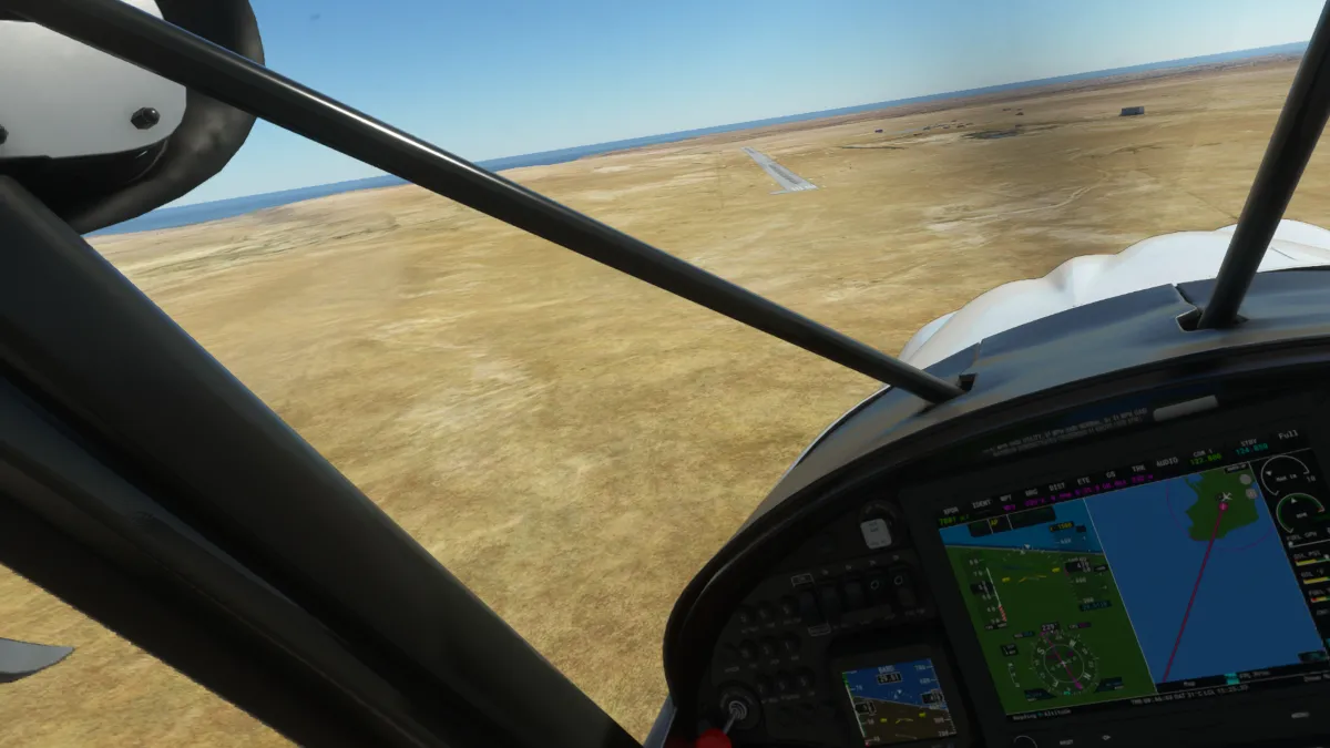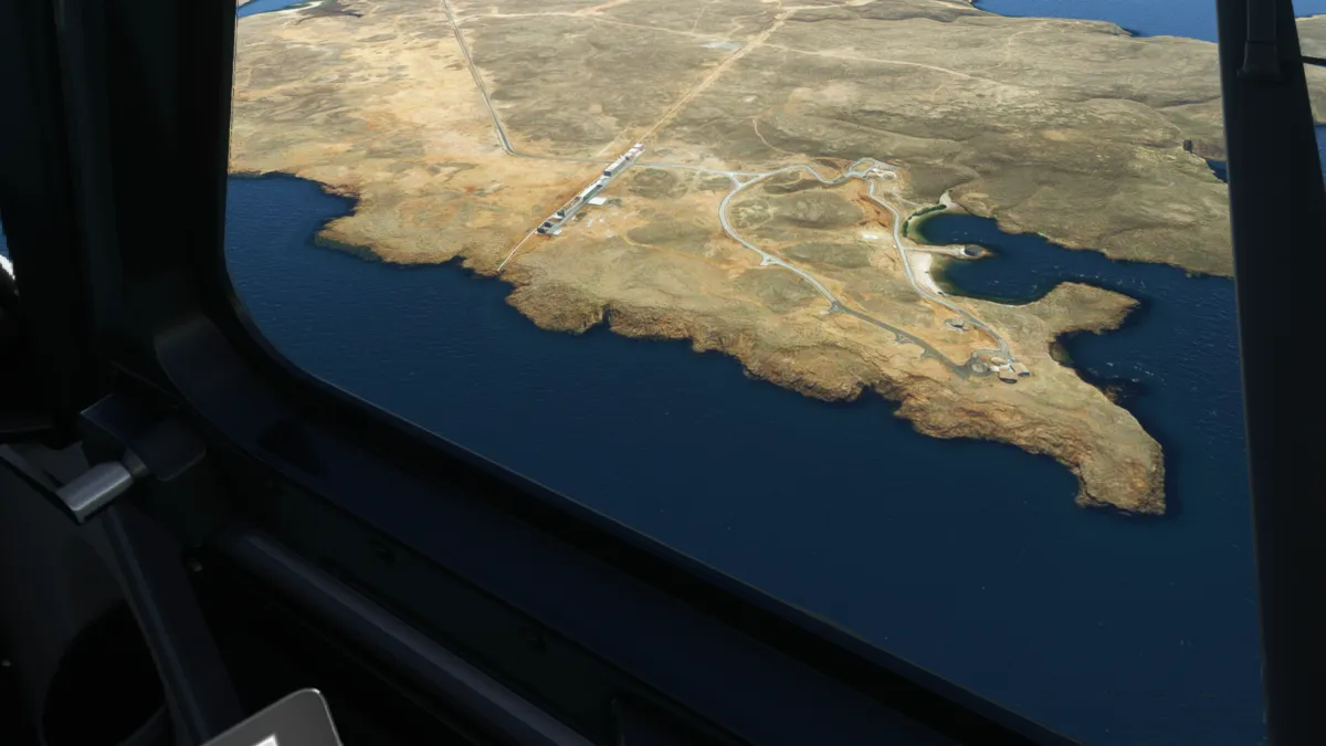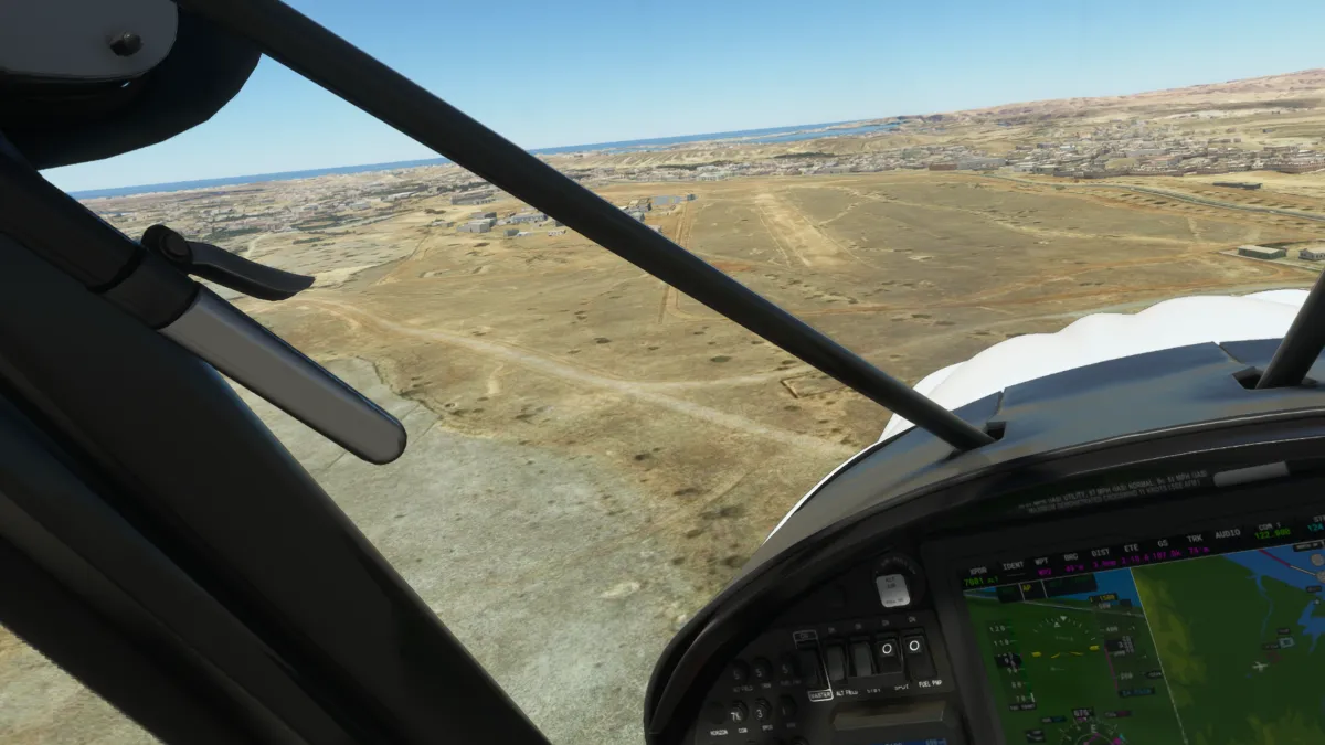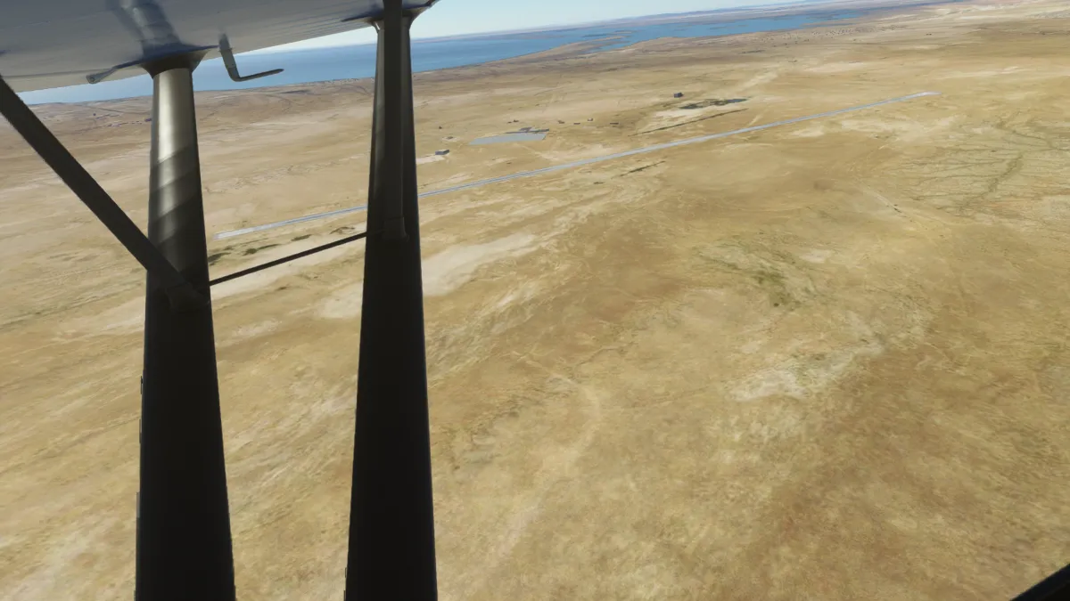 Justo en la península y antes de comenzar el cruce, vimos un aeropuerto que no estaba representado en el simulador, solo en la foto satelital, así que realizamos una pasada baja por lo que sería la pista 15 o 16.