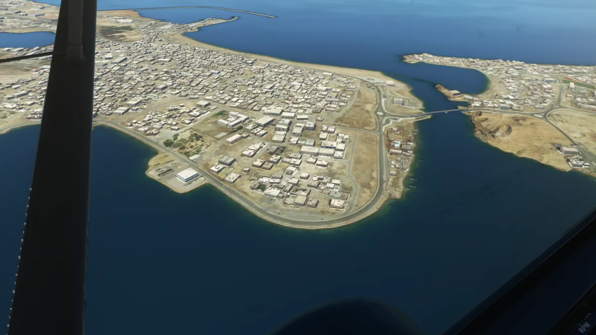Tras cruzar el golfo de Omán, ingresamos a territorio de Pakistán, y nos acercamos a destino mediante viento en cola del circuito a izquierda, para aterrizar por la pista 21 del aeropuerto Jiwani (OPJI) en Pakistán.