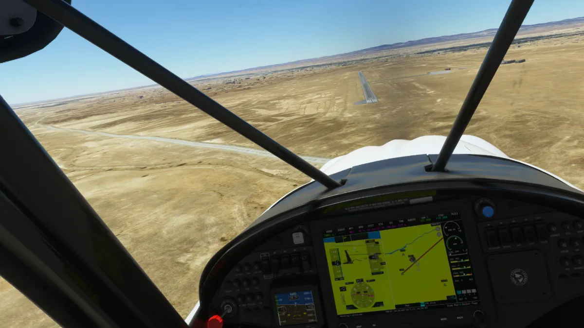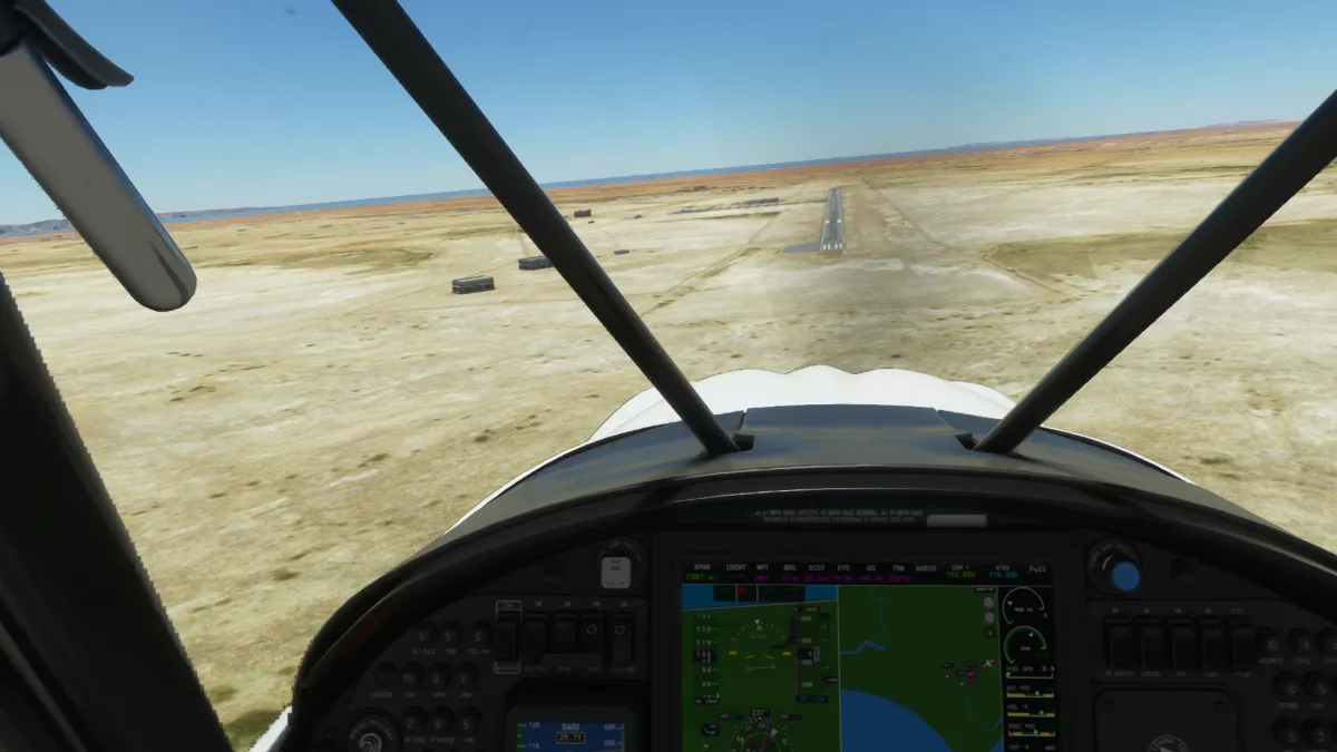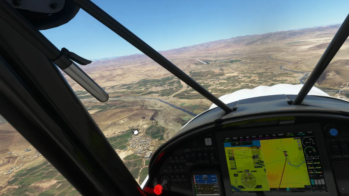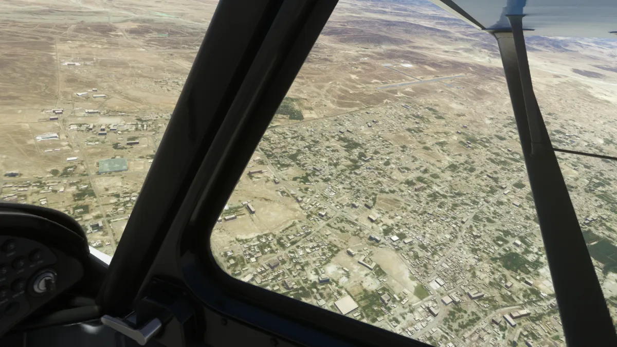 Al ser OOSR un aeropuerto con dos pistas de tierra, no encontramos la primera en una primera pasada, así que tras visualizar donde se encontraba la segunda, realizamos un giro a derechas y encaramos la toma y despegue por la pista 05.