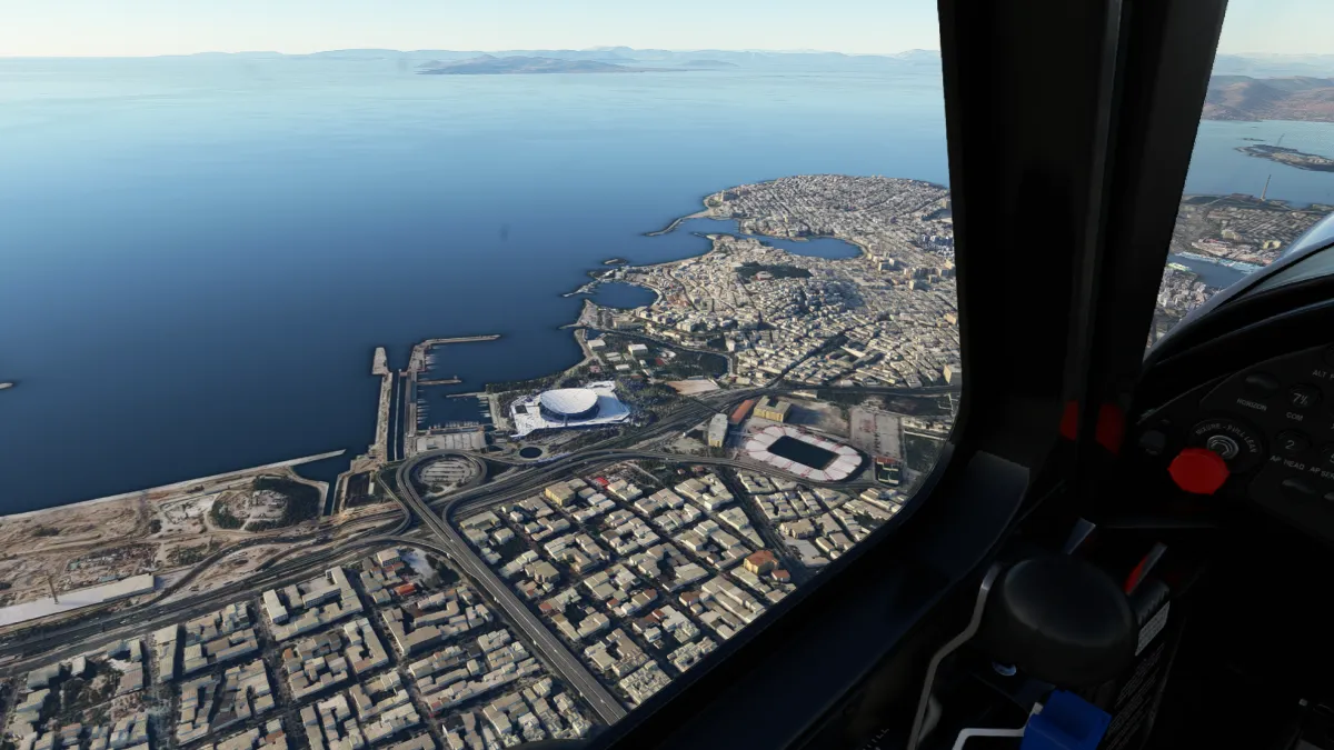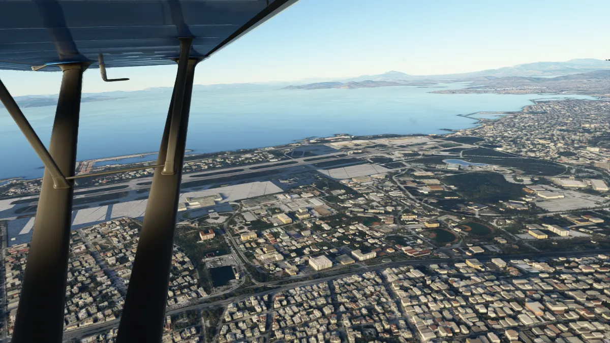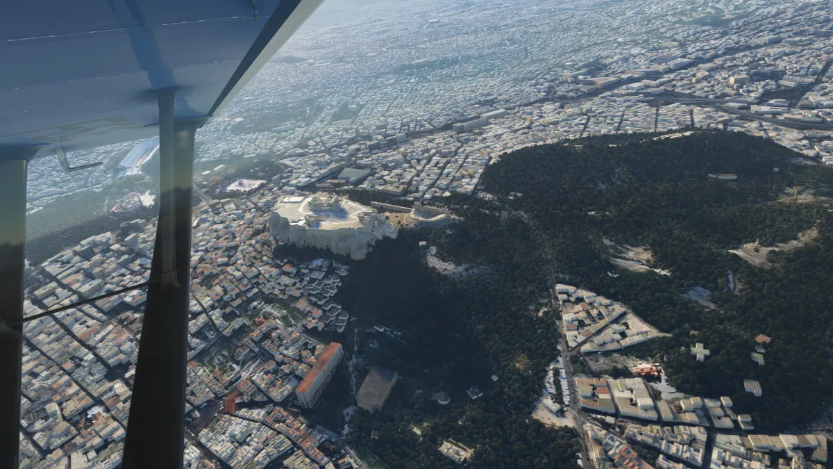 Tras cruzar la aproximación de la pista 03 de LGVA Eleftherios Venizelos Internacional (Atenas) bajo control de radar, y cruzándonos con varios aviones en final, nos dirigimos a la ciudad para visitar desde el aire a la Acrópolis de Atenas y el Partenón.