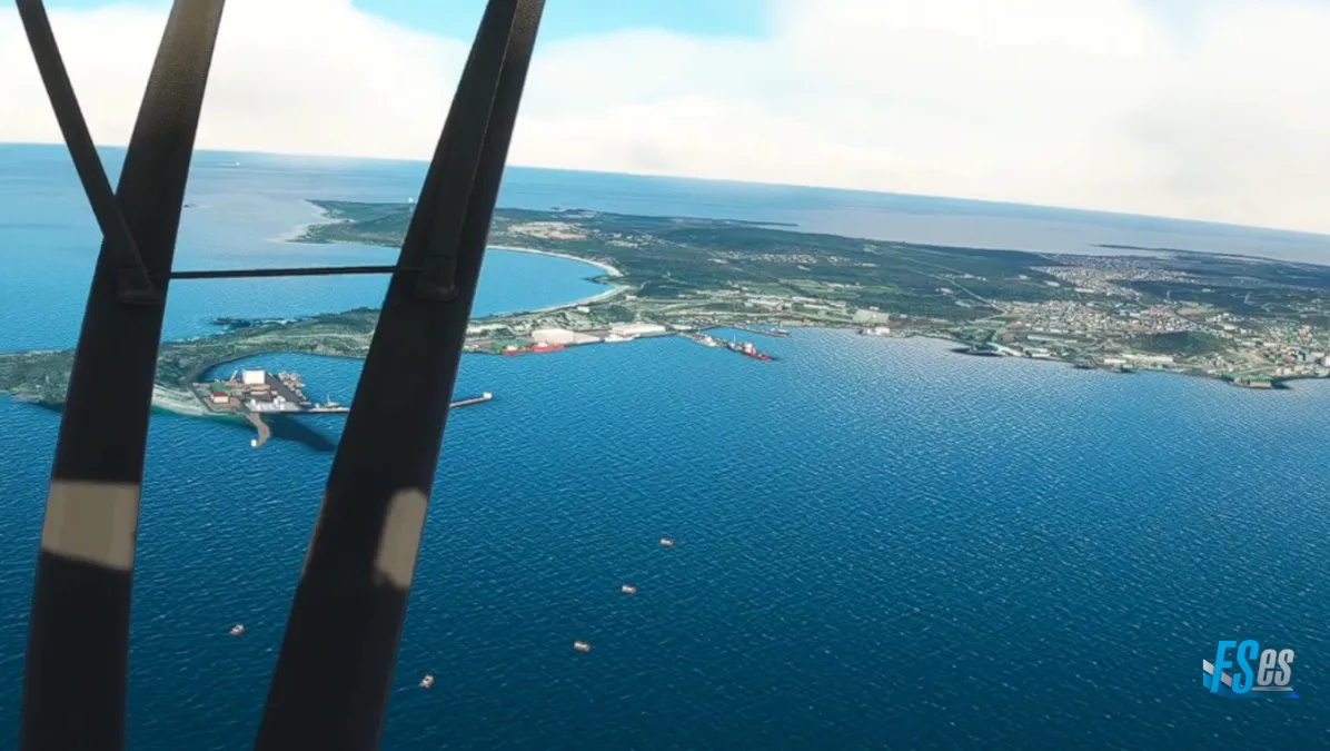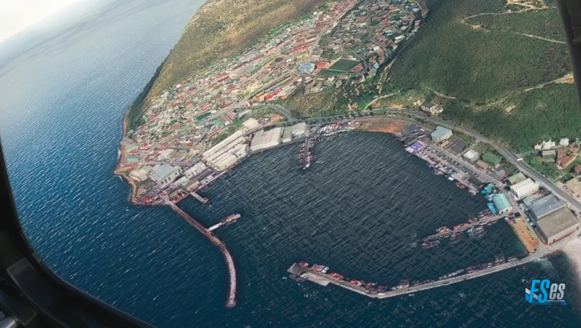 Y luego, dirigiéndonos al puerto de Langebaan para hacer la tercera toma y despegue en el aeródromo de Saldanha-Vredenburg (FASD) ingresando a final de pista 02 y saliendo hacia el océano con circuito izquierdas.
