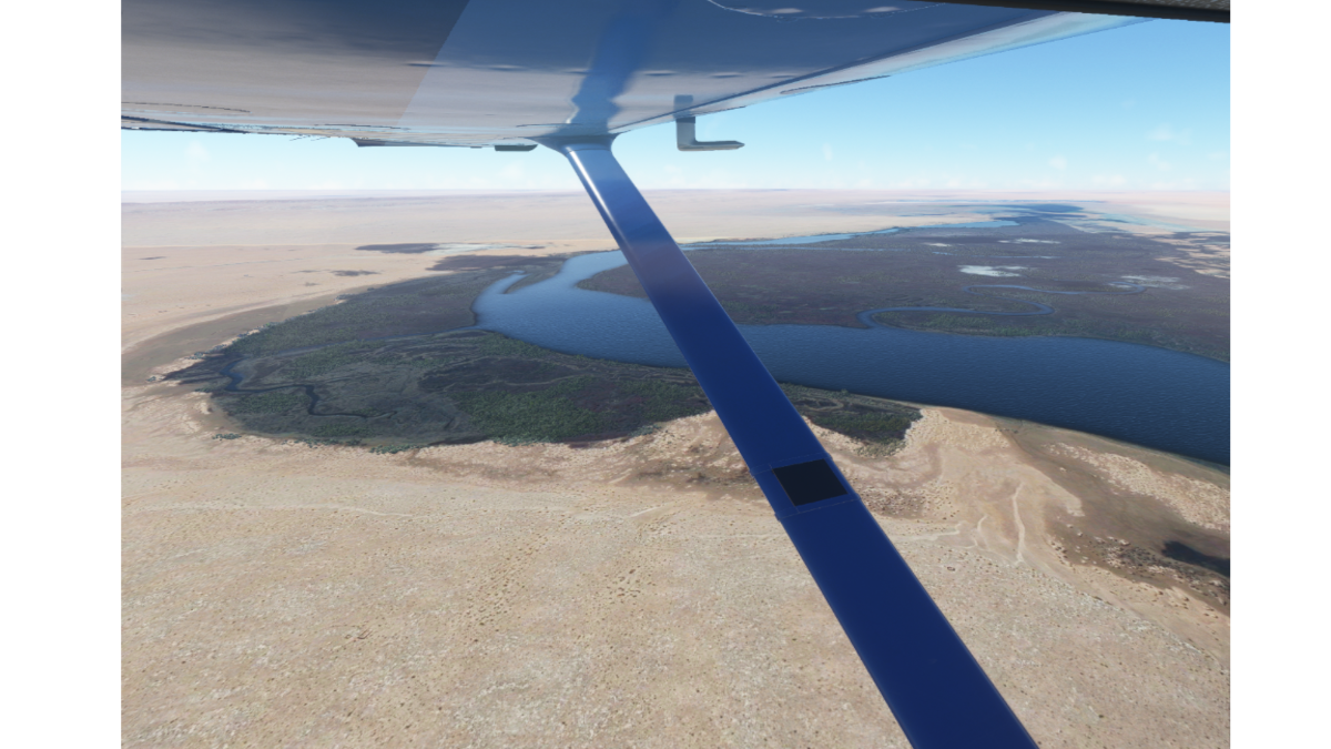 Siempre sobre línea de costa en dirección suroeste, pasamos por el camping de playa blanca hasta llegar al río Draa desde donde nos adentramos para sobrevolar el aeropuerto de Tantan o Playa Blanca (GMAT) en donde realizamos una pasada baja sobre pista 21.